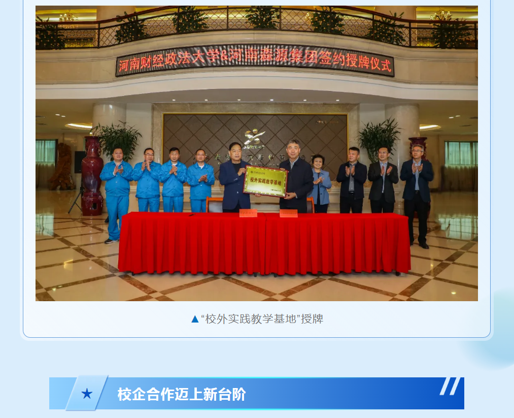 Ag尊龙凯时集团与河南财经政法大学将以此次战略合作协议签订、“校外实践教学基地”授牌为契机,推动双方校企合作迈上新的台阶。